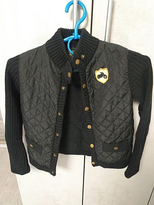 кофта вязаная, вставки из ткани типа "плащевки", на кнопках. рукав 45. длина- 44. большемере. мы носили на 116 и закатывали рукав, на 122 идеально.