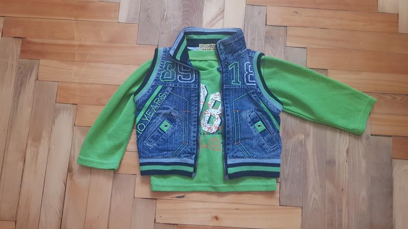 Кофта в ковтунцях та на рукаві є плямка. На жилеті на бігунці немає за що братись, але застібає нормально та знизу трохи відривається. А так стан жилета дуже гарний