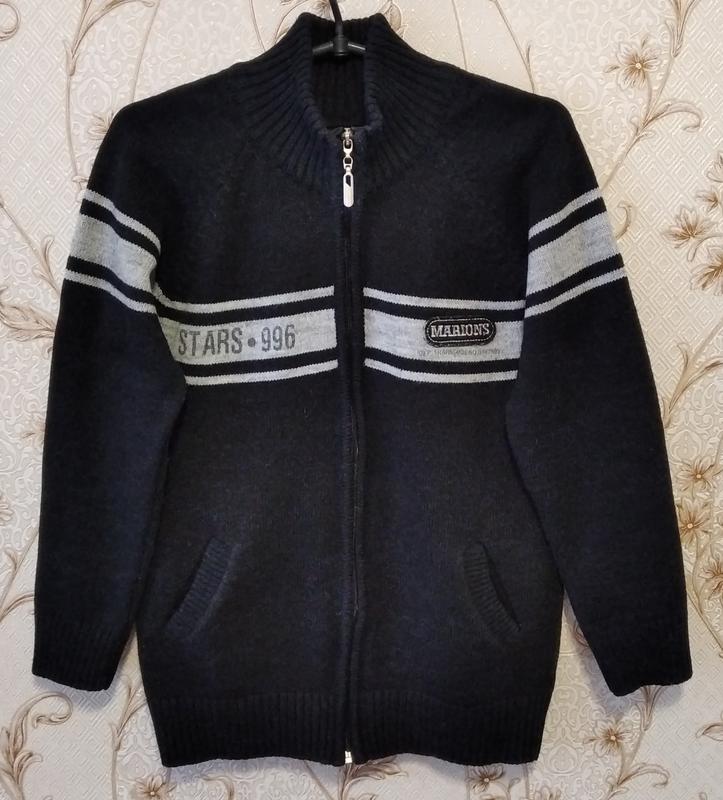 Тепла підліткова в'язана кофта шерстяна ( машинна в'язка) темно-синього кольору, ближче до чорного , на хлопчика 11-13 р. на зріст 146-152 см. Стан ідеальний, є кармани, замочок справний. Манжети на рукавах та по низу не розтягнуті Довжина кофти 60 см Довжина рукава 50 см Ширина. 44 см