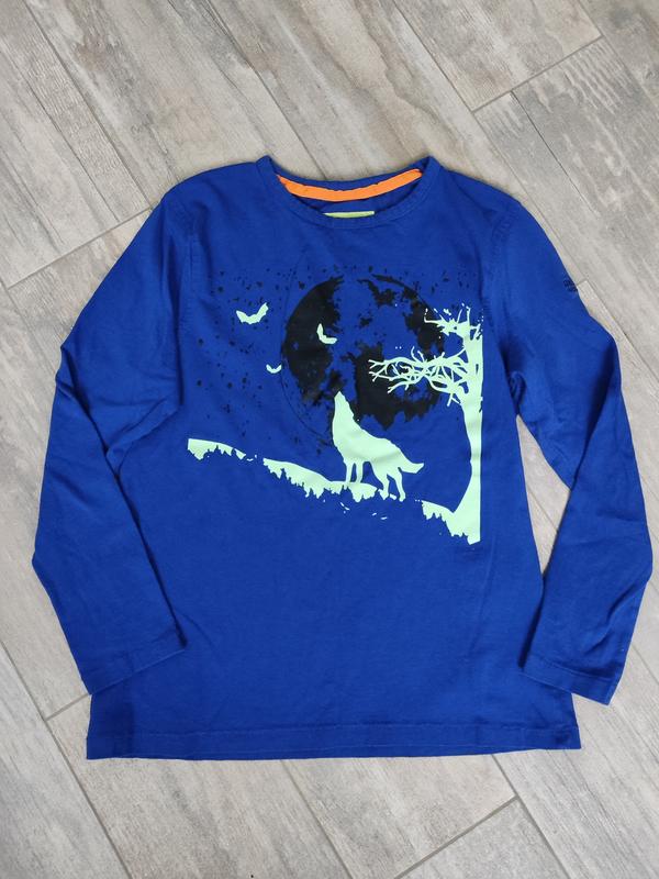 Стильный лонгслив светящийся в темноте. Мягкая, дышащая хлопковая ткань для комфорта. Световой эффект достигается за счет качественного люминесцентного покрытия, которое заряжается от солнечного света или искусственного освещения. Световой рисунок держится до 6 часов в темноте. Состояние нового, без дефектов. Размер на изделии 152, но маломерит пойдёт на 140.