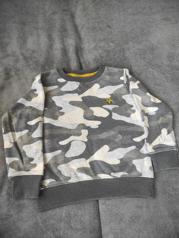 кофта Next для хлопчика Розмір 92-98 колір Сіро-бежевий камуфляж Є дві невеличкі плями є їхнє фото вгорі. Стан нормальний Заміри: рукав 31.5 см довжина 37 см ширина 33.5 см тканина трьохнитка котон.