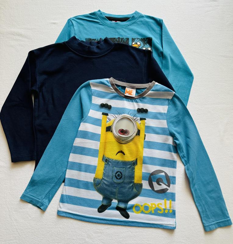 Набір лонгслівів для хлопчика 5–6 років (110–116 см) — 3 шт. Ціна: 180 грн за набір (можливий продаж окремо) 1. Minions (Гадкий Я) George 5-6 років Яскравий лонгслів із міньйоном, об’ємний 3D-елемент з блискітками на окулярі. Дуже класний дизайн, стан добрий. Заміри : довжина - 42 см, груди напівобхват - 34 см, довжина рукава від ворота - 47 см, лінія плечей - 28 см 2. Темно-синій базовий лонгслів (гольфік) Універсальний варіант. Стан добрий, м’яка бавовна. Заміри : довжина - 43 см, груди напівобхват - 37 см, довжина рукава - 36 см, лінія плечей - 39 см довжина плеча - 11 см. 3. Angry Birds 5/6 років Бірюзовий лонгслів із принтом улюблених пташок. Стан добрий, без плям чи пошкоджень. Заміри : довжина - 45 см, груди напівобхват - 34 см, довжина рукава від ворота - 49 см, лінія плечей - 31 см