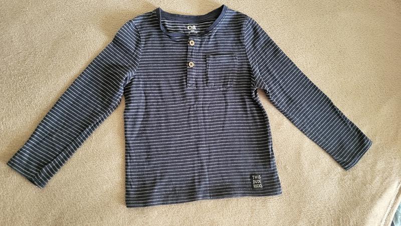 Класний базовий лонг темно-синій у смужку. Підійде на зріст 104-110 см. На бірці вказано зріст 116, але дуже маломірить. Заміри: довжина 42 см, ширина під рукавами 33 см, довжина рукава від плеча 40 см. Стан чудовий, без дефектів і нюансів. Надягали пару раз на вихід.