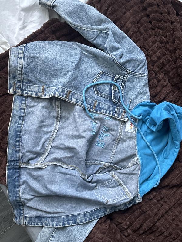 🧥 Стильна джинсова куртка з капюшоном "Moda" 🔹 Розмір: 150 (орієнтовно на вік 10–12 років) 🔹 Матеріал: щільний денім + м’яка трикотажна тканина капюшона 🔹 Колір: світло-блакитний денім з контрастним яскраво-блакитним капюшоном 🔹 Особливості: ✔️ Зручна застібка на ґудзики ✔️ Дві нагрудні кишені з клапанами ✔️ Вишивка всередині з написом “Pula Psamet fortnourte” (дизайнерський елемент) ✔️ М’яка й тепла підкладка капюшона — ідеально для прохолодної погоди 🔹 Стан: дуже добрий, без плям чи пошкоджень 💫 Ідеально підходить для стильних прогулянок, школи або вечірніх прогулянок!