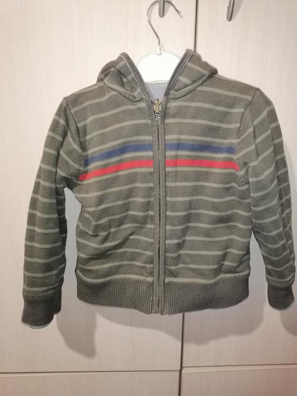 Двухсторонняя трикотажная кофта на молнии, без карманов, с капюшоном. Есть катышки, на молнии отсутствует "язычок", но молния рабочая
