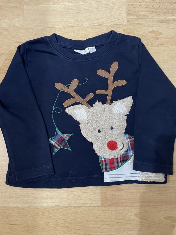 Кофта з принтом оленя. Колір темно-синій Розмір 12-18 міс Довжина 32 см Ширина 31 см Довжина рукава від плеча 28,5 см Плече 5 см