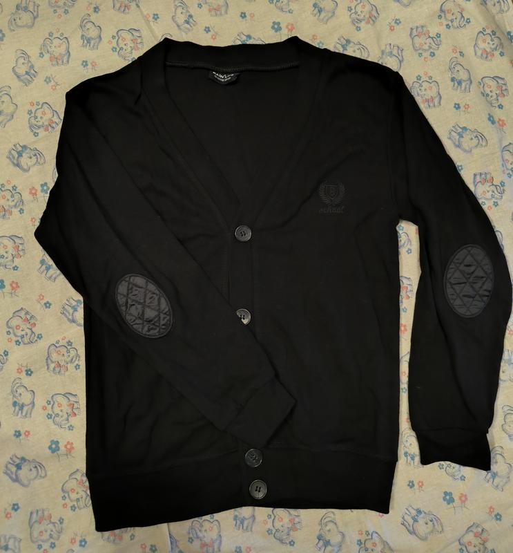 кофта на гудзиках, на хлопчика состояние новой, одетая всего один раз. на локтях вставки для локтей. сбоку надпись school. по наборке 13/14, 158-164. но очень маломерит, смотрите замеры. ориентивно на второй, третий класс в школу