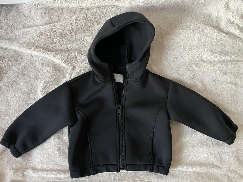 Склад поліестер, еластан. Дуже тепла кофта, ідеальна для тих, хто займається спортом (спортивно-бальні танці тощо.) На блискавці (трохи стерся хром з замочка). Є дві кишені по бокам, на дитину 6 років.