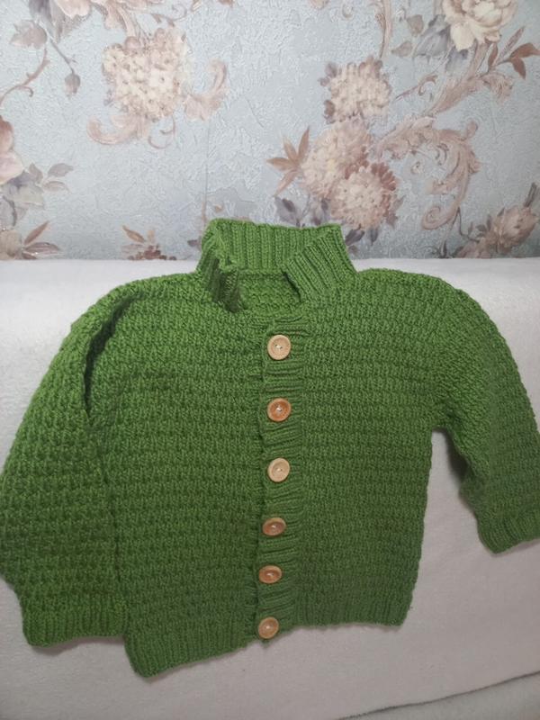 Кофта ручної роботи на хлопчика ,цікаві гудзики із дерева, колір молодої зелені, насичений . Довжина 35см, плечі спущені, довжина рукава від горловини 37, пог 32, склад змішаний, на дотик приємна дуже