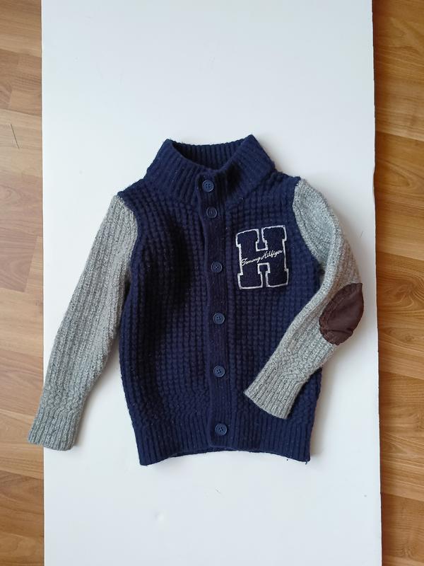 Дуже теплий кардиган на ґудзиках. Щільна в'язка, 78% lambswool вовна. Вказаний розмір 122 (на худенького), або ж 116 см. Заміри на фото. Синя частина з світло-сірими вкрапленнями пряжи, сірі рукава з нашивками на ліктях. Спереду велике лого тедді, на спині маленьке вишите лого. Новий стан без зауважень.