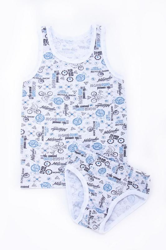 Комплект майка + труси виконані з м'якого та приємного до тіла трикотажного полотна "кулір". Підходить для щоденного використання. Призначений для хлопчиків віком від 9 місяців до 7 років залежно від зросту. Склад полотна: 100% бавовна.