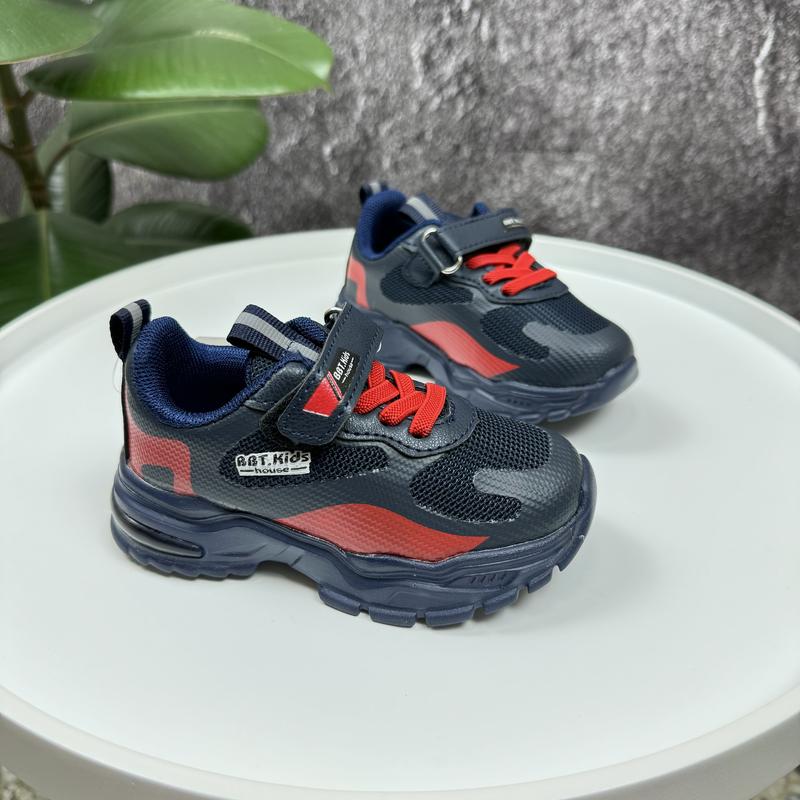 👟Кросівки темно сині з червоним. Верх - еко шкіра, текстиль. Шнурівка декоративна. Застібка - липучка. Підошва - піна. Устілка - Шкіра, супінатор 📐Заміри: 21 - 13,2 23 - 14,3 24 - 14,7 25 - 15 26 - 15,6