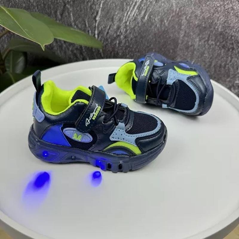 🦋Кросівки сині Sport kids світяшки. Устілка- шкіра, супінатор . Верх- щільний текстиль . Підошва- піна. Застібка- липучка. Шнурівка- обманка 📐Заміри: 21 - 13,5 22- 14 23 - 14,5 24 - 15 25 - 15,5 26 - 16,5
