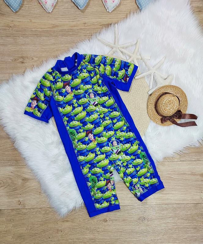 Matalan на 3-4 роки (98-104 см), красивенький купальний костюм "Історія Іграшок", захист від ультрафіолету (для чутливої шкіри), еластичний матеріал лайкра, на спинці застібка змійка, стан ідеальний, (довжина 61 см, крок 17 см, напівобхват грудей 28 см, рукав від горловини 23 см)