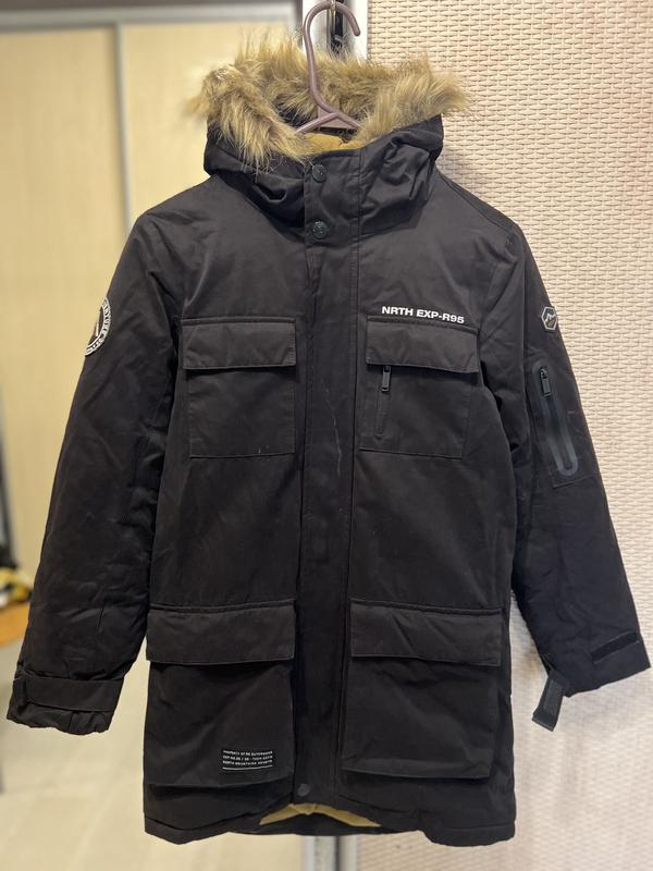 Курточка на хлопчика. 152 розмір. Носив сезон. Сзаду подовжена, манжети на резинці, регулюються липучками.Хутро з капюшону знімається. В середині на флісі. Довжина спереду 77см Довжина сзаду 83см Рукав до плеча 58см Плече 10см ПОГ 49см