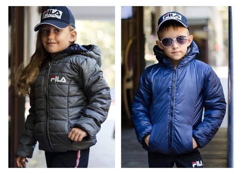 DO№648 Двухстороння демісезонна курточка "Fila". Модель унісекс. Тканина - плащівка, наповнювач силікон 150 Двостороння куртка з капюшоном на блискавці, на обох сторонах кармани. Колір - сірий + синій На фото куртка з двох сторін!!! Розміри - 122-128,128-134,134-140,140-146. Заміри в фото. Ціна 735 грн.