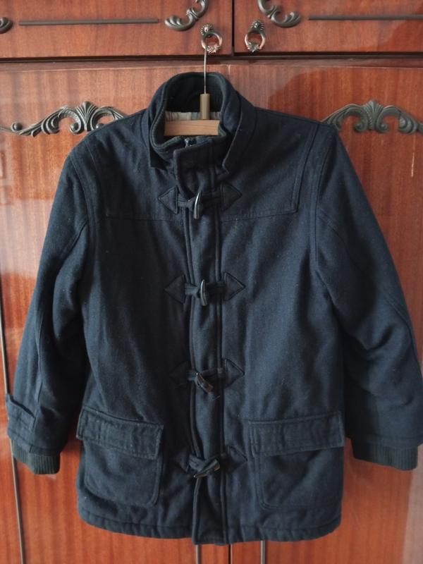 Куртка тепла на хлопчика 9-12 років фірми Marks Spenser темно- синього кольору. Верх - ніжний, м'який драп. Підкладка - вата, поверху байка. Модний,стильний пошив зі вставками та поясками. Дизайнерські гудзики у вигляді ікл. Манжети рукавів з резинки,що дає рукаву щільно прилягати. Ширина грудей під рукавами - 45 см. ширина плечей - 40 см. довжина рукава - 52 см. загальна довжина - 63 см. Ріст- 140 см. 100 % - бавовна.
