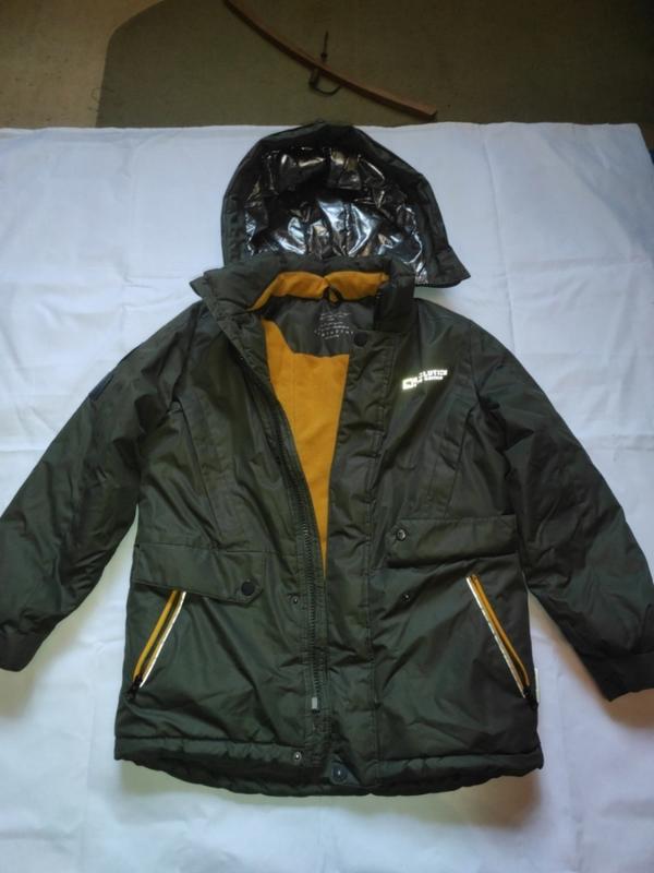 Зимова тепла, водовідштовхувальна. На флісі. Багато кишень. Капюшон знімається. є невеличка подряпина непомітна. довжина спереду 60 см. Ширина 48 см