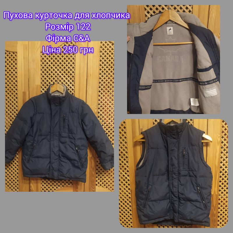 Замечательная курточка для мальчика фирмы C&A, темно-синего цвета. Курточка зимова, пухова. Сзади чуточку длиннее ножа спереди. Размер 122. Рукава отщипываются и делается безрукавка. Красиво носится и в хорошем состоянии.