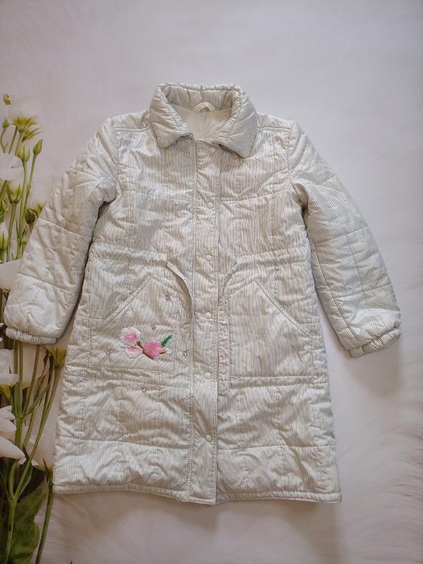 Дитяча куртка, пальто. Розмір - на 140. Напівобхват грудей - 44 см. Напівобхват талії - 45 см. Напівобхват стегон - 50 см. Плечі - 38 см. Довжина рукава - 48 см. Довжина всієї речі - 75 см. Тканина не тягнеться. ❗❗З дефектів в середині на підкладці є зачіпки та назовні на попі є одна маленька дірочка.❗❗ ✨✨✨Акція 5 за ціною 4 ✨✨✨ На весь жіночій та дитячій одяг. Діє тільки на товари по повній вартості. ❗❗Якщо на товар діє акційна ціна,то додатково акція на ці позиції не діє, можна замовлення зробити по знижених цінах без акції, або ж по повній вартості з врахуванням акції❗❗
