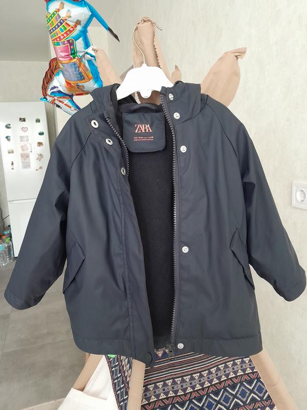 Утеплена флісом водо- та вітронепроникна куртка Zara, з прорезиненого матеріалу, розмір 92. Курточка з капюшомом, манжетиками на резиночках та кишенями на кнопках. Колір темно синій. Довжина 41 см Ширина 37 см Довжина рукава від горловини 37 см