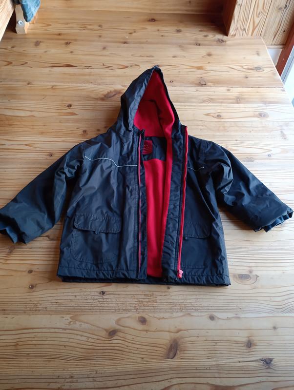 Чорна курточка на червоному флісі з капюшоном,на блискавці,з карманами на липучках на хлопчика ростом 122 см.Із недоліків-потертіст на правому кармані-на останньому фото.Заміри:пог 46 см, довжина рукава 40 см, довжина куртки 53 см