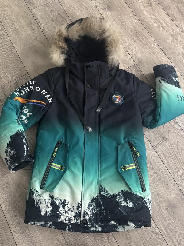 Зимова куртка для хлопчика розмір по бірці 140, ми носили в 9-10 років, в гарному стані, тепла, стан на фото, можу зняти додатково. Хутро натуральне, зємне, капюшон зємний. на питання відповім. Довжина від горловини спереду 65, по спині 70, ширина по грудях під рукавами 48, довжина рукава від плеча 53, ширина по плечам 39.