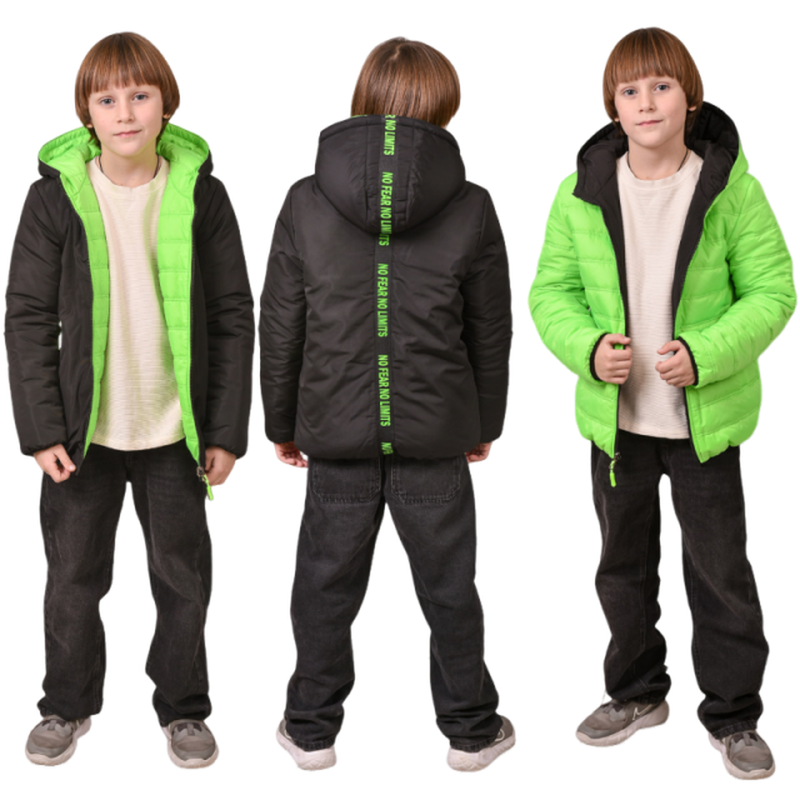 Стильна куртка 2 в 1 для весни та осені на рости 116-158 Кольори в асортименті: -Чорна з салатним -Синя з жовтим -Чорна з помаранчевим -Чорна з сірим 1.Перша сторона: Куртка виготовлена з міцної плащової тканини Меморі з матовим блиском і водовідштовхувальним покриттям. Застібається на блискавку. Основна блискавка та кишені декоровані світловідбивною кольоровою окантовкою. На спинці – стильна світловідбивна тасьма з модним принтом. 2.Друга сторона: Матеріал – плащова тканина Лаке з матовим блиском. Сучасна стібка з подвійними суміжними рядками додає виробу особливого стилю. Є дві зручні кишені з обробкою «листочка». Деталі: ✅ Утеплена подвійним силіконом (150 г). ✅ Низ куртки та рукава оброблені еластичною окантовкою. ✅ Вшитий капюшон для захисту від вітру. ✅ Ідеальний вибір для прохолодної весни та осені. Розмірна сітка: 32 (116-122 см) – довжина 50 см, рукав 46 см, ширина під рукавами 40 см, плечі 32 см. 34 (122-128 см) – довжина 52 см, рукав 48 см, ширина під рукавами 42 см, плечі 34 см. 36 (128-134 см) – довжина 55 см, рукав 51 см, ширина під рукавами 44 см, плечі 36 см. 38 (134-140 см) – довжина 57 см, рукав 53 см, ширина під рукавами 46 см, плечі 38 см. 40 (140-146 см) – довжина 60 см, рукав 55 см, ширина під рукавами 48 см, плечі 40 см. 42 (146-152 см) – довжина 63 см, рукав 58 см, ширина під рукавами 49 см, плечі 42 см. 44 (152-158 см) – довжина 65 см, рукав 62 см, ширина під рукавами 50 см, плечі 44 см. 46 (158-164 см) – довжина 68 см, рукав 65 см, ширина під рукавами 52 см, плечі 45 см. (Допустиме відхилення в замірах ±1-2 см) Ця універсальна куртка стане улюбленою річчю у гардеробі вашого модника! 💙
