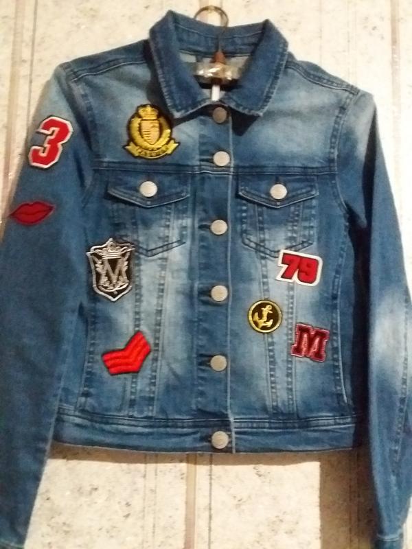 джинсова курточка, MONITO, denim collection, 34р, колір синій із світлими потертостями, оздоблена яскравими наліпками, які міцно пришиті, з фірмовими гудзиками, плечі36, ПОГ 39, рукав 56, низ і рукав на манжетах.