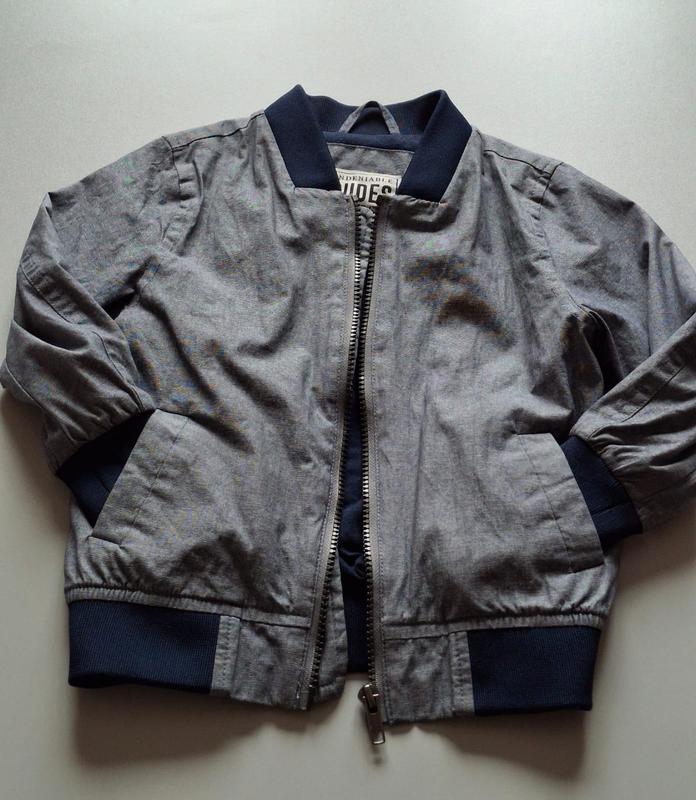 Куртка для хлопчика, на підкладці, без утеплення Деталі: 2 зовнішні кишені Розмір: 2-3 рочки Заміри: ПОГ - 35см Довжина по спинці, без комірця - 38,5см Довжина рукава - 34см Нова
