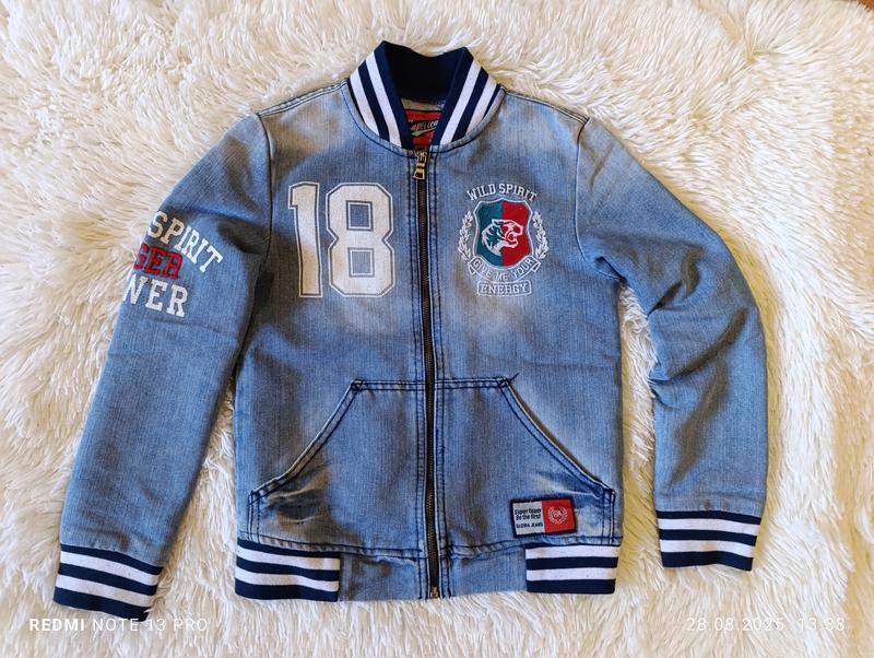Джинсовий бомбер для хлопця..9-11 років.Але дивіться заміри. Довжмна 52 см. Ширина 39 см. Рукав 52 см.