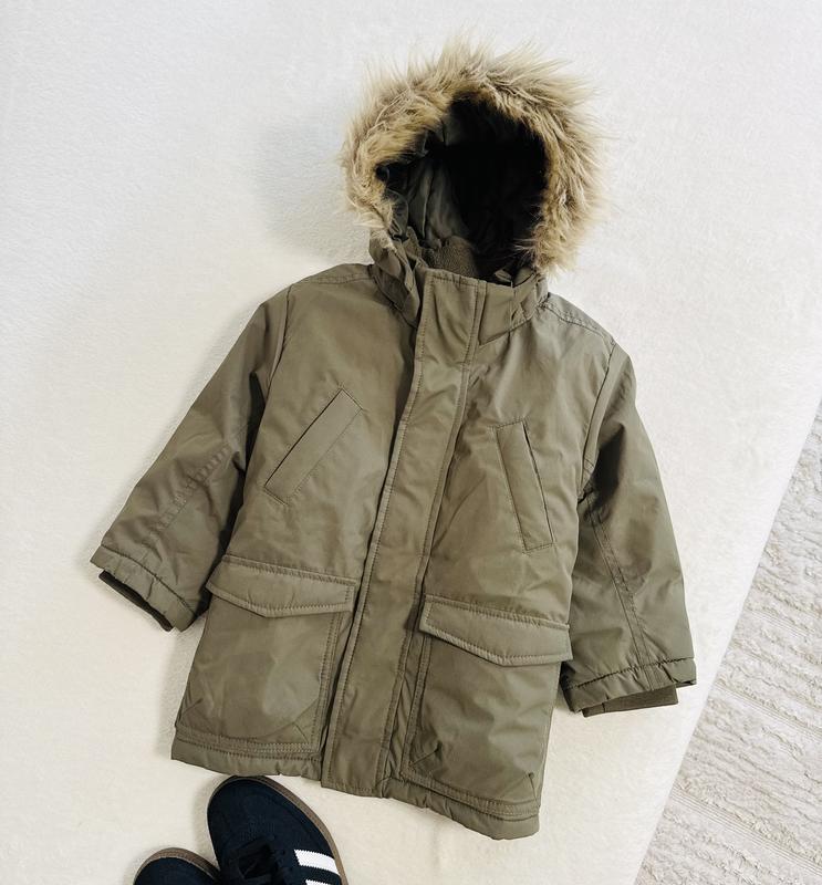 Курточка від H&M Кольору хакі, капішон відщіпається Розмір 2-4 р на зріст 98/104 см По грудей 41 см Рукав 41-33 см Плечі 33 см Довжина 48 см