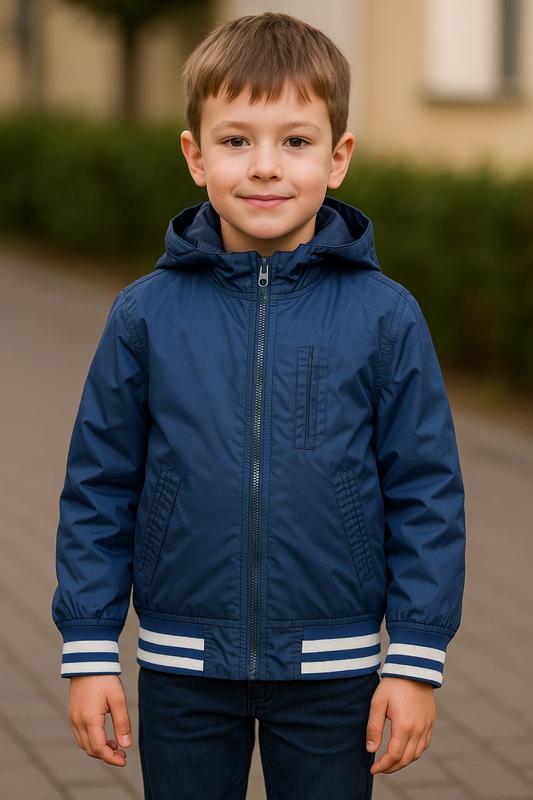 Французький бренд DPAM • Синій верх, манжети та пояс з трикотажу з білими смужками • Капюшон, який ховається у комір • Стильна блискавка + додаткова кишеня зверху • Внутрішня частина: м’яка сіра підкладка з принтом 🔎 УВАГА: Є ледь помітне світле плямце біля блискавки на грудях (див. останнє фото). В око не кидається, на загальний вигляд не впливає. 📏 Заміри: Довжина по спинці: 45 см Ширина під руками (ПОГ): 38 см Довжина рукава від плеча: 41 см Довжина рукава від підмишки: 30 см Плечі: 31 см Підійде на хлопчика 5,5–7 років залежно від комплекції