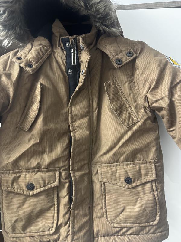 Дитяча тепла вимова куртка. З капюшоном, хутро відстібається. Розмір 110. Стан причудовий. Довжина 48, Рукав - 42 Напівширина - 39
