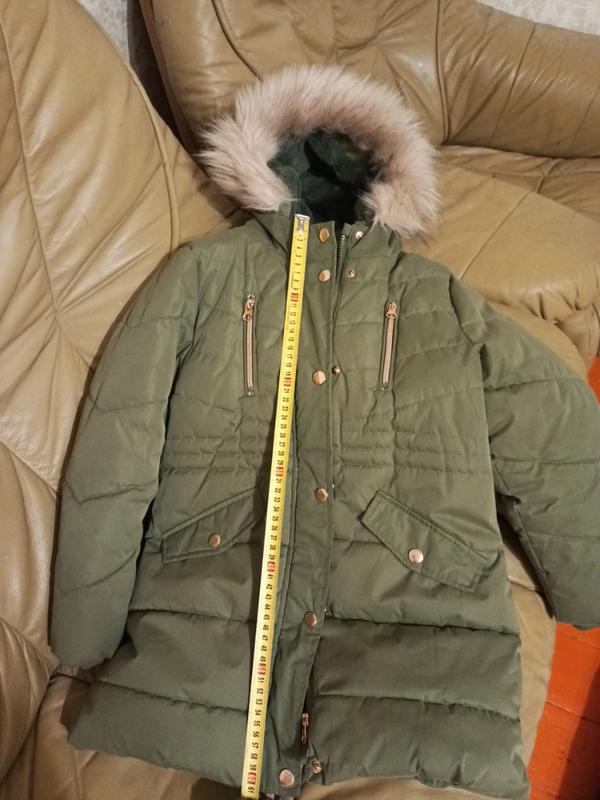 Курточка дитяча зимова, дуже тепла,та легка.Подовжена з капюшоном.Колір захисний,темно -зелений.Під пахвою потрібно зашити по шву 7сантиметрів, Довжина від плеча до низу куртки 60см, довжина під пахвою до низу рукава 36см, ширина куртки 40см.