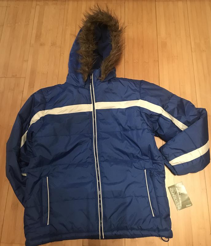 Синя куртка дуже тепла всередині фліс.Вночі відбивається біла полоска.На етикетці написано 8-12 років(143-155) плечі-41см;Пог-48см;довжина-56см та довжина рукава-54см.Купували в Іспанії.