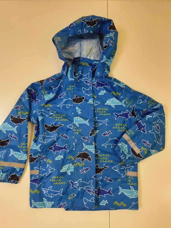 Тоненький річний дощовичок в дуже хорошому стані на хлопчика 3-4 роки.Довжина по спинці 44см, довжина рукава від плеча 39див,ширина під пахвами 36см.
