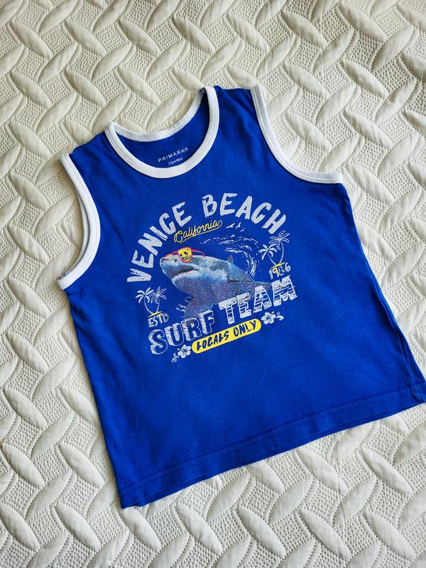 Дитяча літня майка на хлопчика Primark в ідеальному стані. Дефектів, нюансів немає. Розмір 98-104см. ЗАМІРИ Плечі - 24,5см ПОГ - 32см Довжина - 38см Є олх-доставка