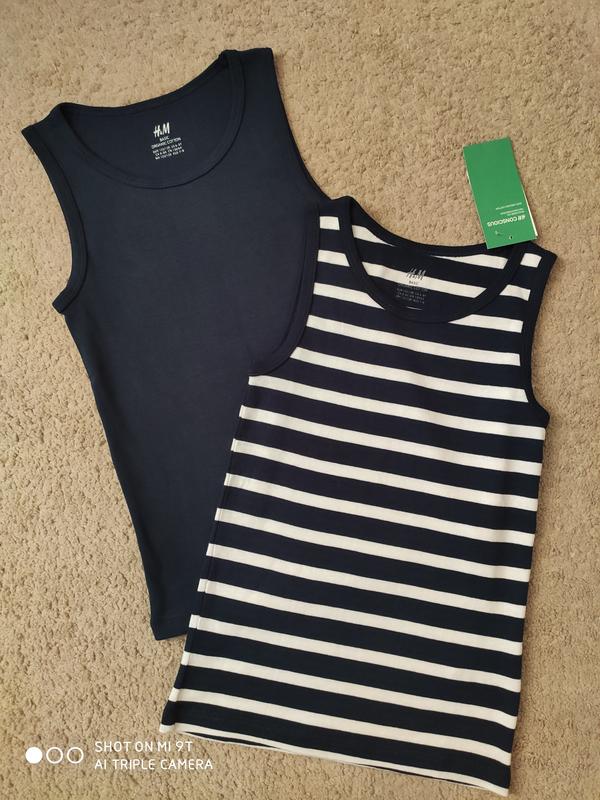 Маечки(комплект) коллекции basic от шведской фирмы H&M. Размер 6-8У( по размерной сетке фирмы на рост 122-128см). Замеры полосатой маечки: длина сзади от плеча -48см, ширина -30см. Замеры синей маечки - длина сзади от плеча -48см, ширина -28см. Состав: 100% органический хлопок, очень мягкий и приятный на ощупь. Цена за одну маечку-160грн.