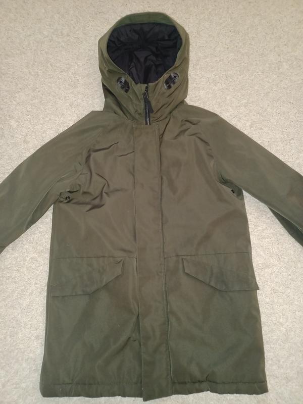 В чудовому стані. Купували нову, син носив після зими весною до потепління і осінню до зимової. Дуже гарно закриває тіло дитини, чудова якість. Вона цупка, гарне наповнення, якісно зроблена. Верх 100% поліестр, підкладка-100% нейлон, наповнення -100% поліестр Довжина - 66см. ПОГ- 51см. рукав від шиї-65см