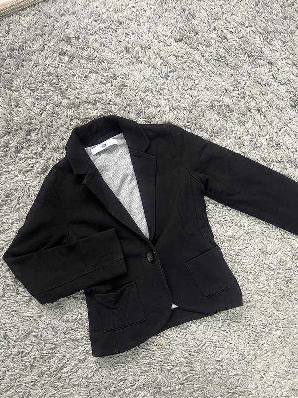 Піджак на вік 5років,в дуже гарному стані ,чорний,від M&S,заміри довжина від плеча 41см,ширина в талії в защіпнотому вигляді 29см,довжина рукава 41,тканина ще трішки тягнеться,талія завужена