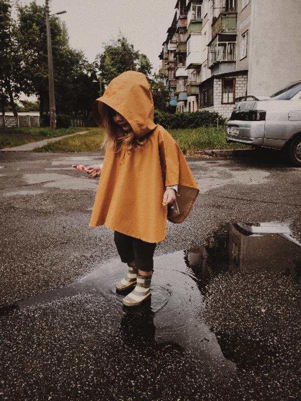 Новий дитячий літній дощовик пончо. Матеріал болонья, без підкладали. Річний ,зручний, легкий, складається в маленький зручний чохол, який легко поміщається в сумочку і не займає місця.Ручна робота. На ріст 86-92 На фото дитина зростанням 93 див.