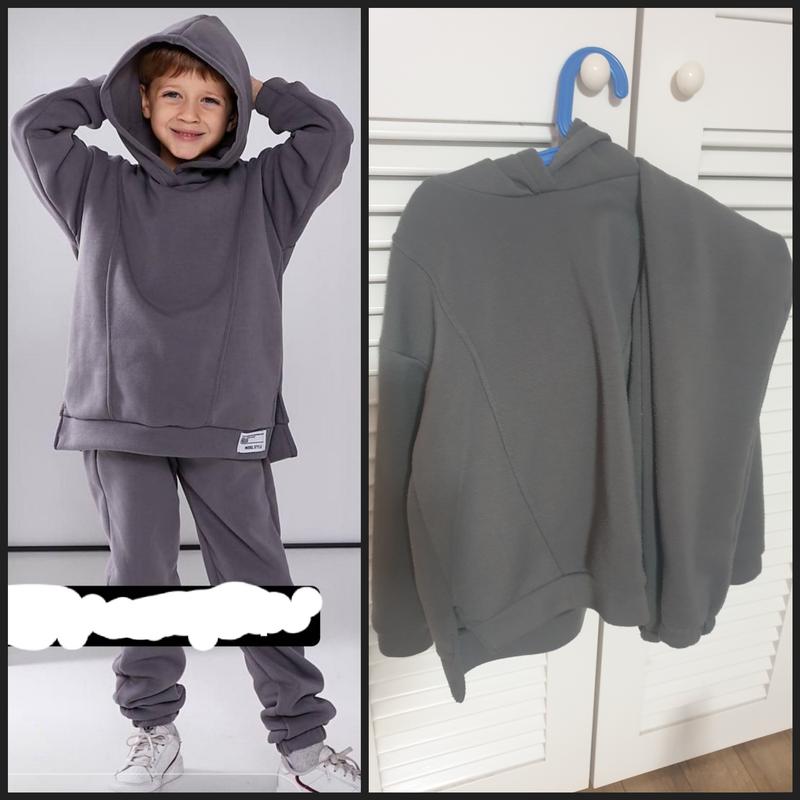 Костюм утеплений на флісі, бірки зі складом не було, замовляла в інстаграм минулого року. Носили минулої зими на переміну з іншим одягом в школу. Не маломірить, по бірці йде 128, дивіться заміри. Кофтинка подовжена оверсайз , класна, рукав теж приспущений. Колір сірий, приємний, такий як на 1му фото із сайту. Стан дуже хороший, без дефектів, просто є катишки. В моїх оголошеннях є і інший одяг на хлопчика