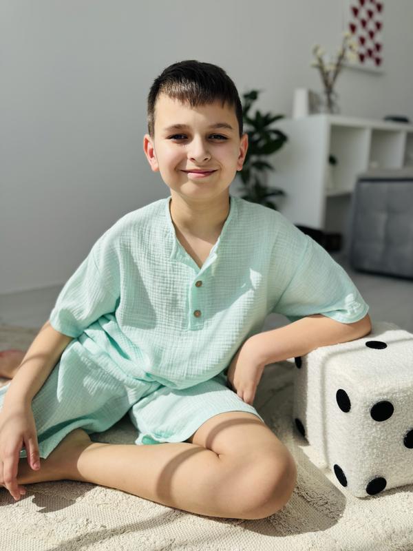 Дитячий костюм з муслінової тканини - це поєднання неперевершеної якості та природної краси. Муслін- це дихаючий матеріал, який забезпечує відмінну вентиляцію та комфорт під час спекотних днів. Крім того, він дуже м'який та приємний до тіла, що робить його ідеальним вибором для дітей. Наші костюми мають стильний дизайн і високу якість пошиву, що додає ще більше привабливості до цього вбрання. Вони ідеально підійдуть як для прогулянок у місті, так і для відпочинку на природі, надаючи вашій дитині неповторний шарм та комфорт у будь-якій обстановці. Тканина муслін, виробництва Туреччина Сорочка на 3-х ґудзиках з коротким рукавом Шорти до колін, вільного крою