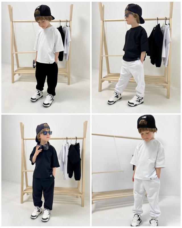 два набори - чотири образи Оверсайз футболка з якісної турецької двонитки (95% бавовна) м'яка, дихаюча та приємна до тіла. У парі з нею оверсайз джогери з тринитки (95% бавовна) - зручні, стильні та ідеальні для активних діток. Два класичні кольори: чорний та білий - легко комбінуються з будь-яким гардеробом. Розміри: від 92 до 134 см футболка: 92-110 см / 440 грн 116-134 см / 480 грн джогери: 92-110 см / 640 грн 116-134 см / 680 грн