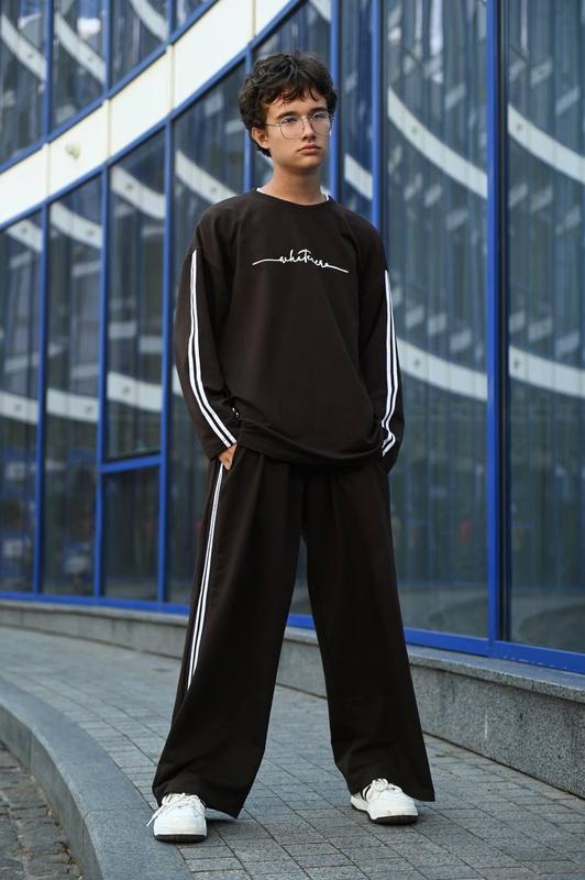 Стильний підлітковий костюм ОВЕРСАЙЗ ! ‼️№2545‼️ Тканина - турецька хб двонитка піньє з щільним плетінням, високої якості !Не линяє, не скочується, гарно тримає форму. Високої якості пошиття. Слад: 85% ☑️бавовна, 10% ☑️віскоза, 5% ☑️еластан В поясі резинка та шнурок який допомагає коригувати об'єм . Розміри - 146-152, 152-158, 158-164, 164-170 Колір- коричневий
