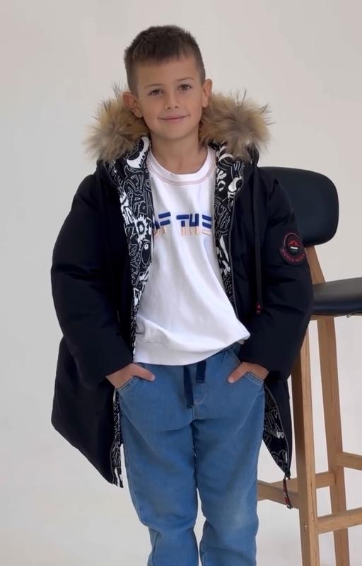 Продам Двостороню зимову курточку на хлопчика в чудовому стані. тканина із водовідштовхним ефектом. Розміром 152, купувала більш ніж за 2000грн. одна сторона з принтом, інша чорного кольору, всі замки працюють. •температурний режим до -25* •натуральне хутро на капюшоні -зйомне •якісна та немарка тканина ,яка легко протирається серветкою •манжетики на рукавах довжина 87см, плечі 44см, довжина рукава 62см, нап.об груд 55см по капішоні є нажаль ньюанси -зацепи. але вони ледь замітні