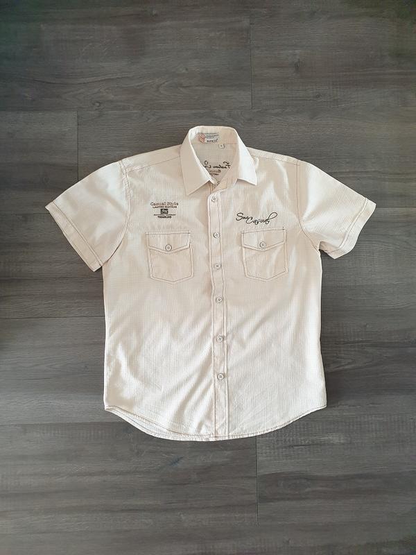Підліткова сорочка збаної якості фірми Semco Textile. Фірма Semco є виробником високоякісного турецького одягу. 100% котон, колір слонова кістка, вистрочення чорними нитками. Спереду зверху накладні кишені, кишені діють, закриваються на клапан і ґудзик. Розмір М, буде добре на наш 42-44-46. Заміри: НОГ 50 см, довжина 69 см, довжина рукава 21 см, плечі 40 см.