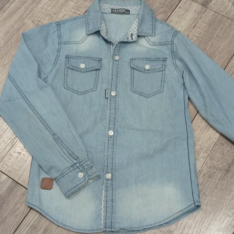 Джинсова сорочка на хлопчика 8,9,10 років.Довжина по спинці 57,см.Ширина 75 см.Довжина плеча 10 см,довжина рукава від плеча 52 см.