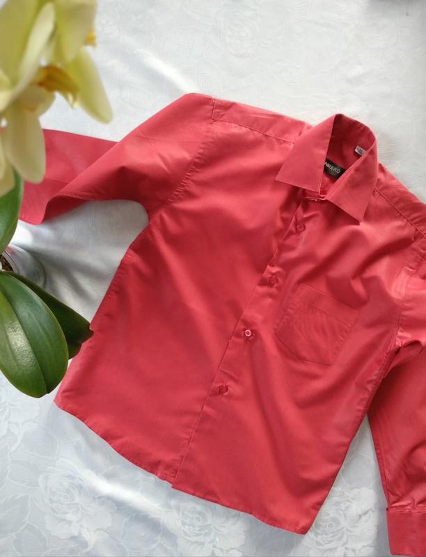 Сорочка коралова на хлопчика (ріст 136), на вік 9-11 років. Красива сорочка у ідеальному стані. Заміри: довжина виробу 50см ширина плечей 37см довжина рукава від плеча 46см
